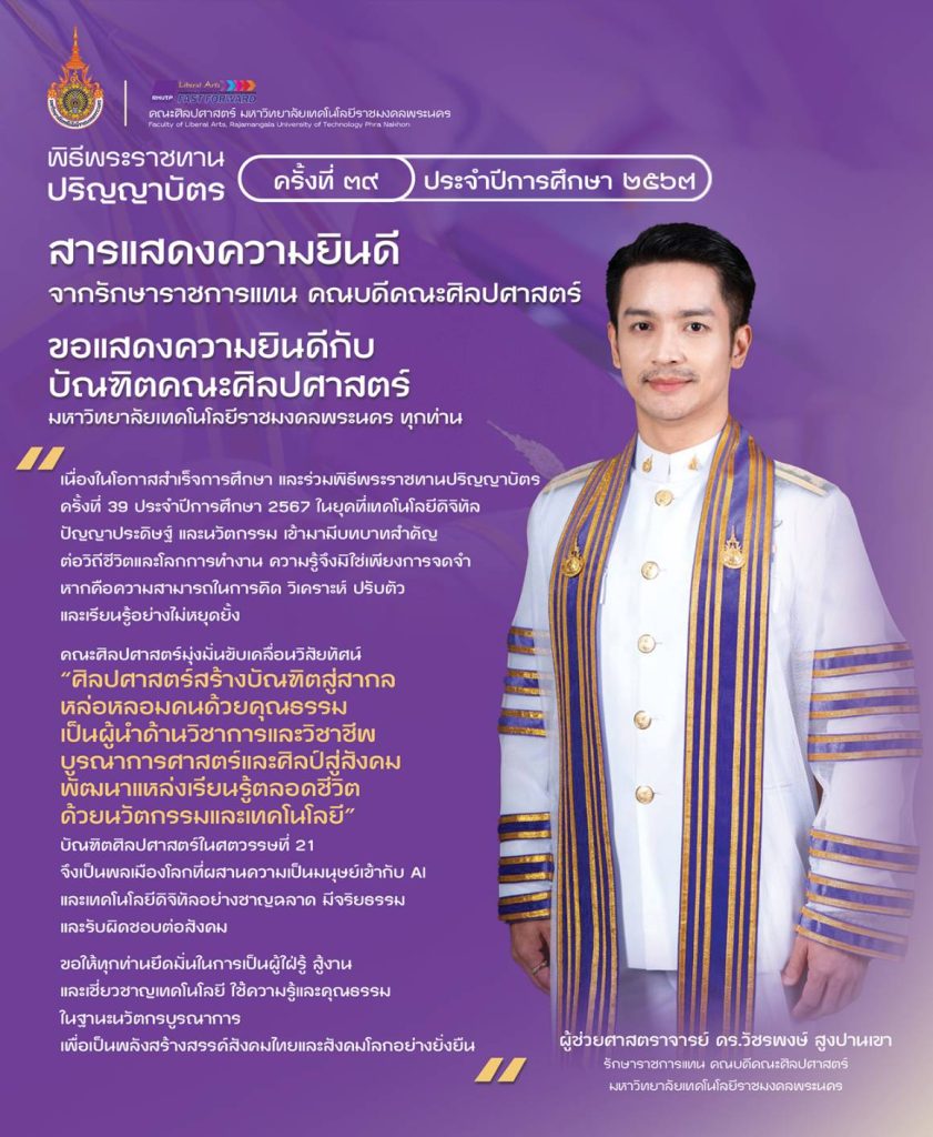 ข่าวในพระราชสำนัก องคมนตรี ผู้แทนพระองค์ พระราชทานปริญญาบัตร แก่ บัณฑิต ของ มหาวิทยาลัยเทคโนโลยีราชมงคลพระนคร และมหาวิทยาลัยเทคโนโลยีราชมงคลรัตนโกสินทร์ เมื่อวันที่ ๒๒ พฤศจิกายน พุทธศักราช ๒๕๖๗ ณ หอประชุมพุทธมณฑล จังหวัดนครปฐม #ศิลปศาสตร์ ฟาสฟอร์เวิร์ด