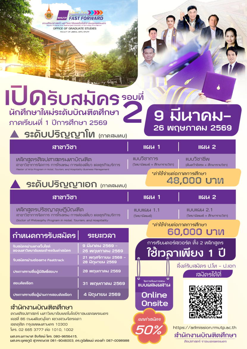 สำนักงานบัณฑิตศึกษา คณะศิลปศาสตร์ ม.ราชมงคลพระนคร เปิดรับศมัครนักศึกษาใหม่ รับสมัครนักศึกษาระดับปริญญาโทและปริญญาเอก (รอบ2) 9 มีนาคม 2569 – 26 พฤษภาคม 2569 ศิลปศาสตรมหาบัณฑิต สาขาวิชาการจัดการการโรงแรม การท่องเที่ยว และธุรกิจบริการ >> ดูรายละเอียดเพิ่มเติมได้ที่ https://www.rmutp.ac.th/ศศ.ม.การจัดการการโรงแรมการท่องเที่ยวและธุรกิจบริการ …………………………………. ปรัชญาดุษฎีบัณฑิต สาขาวิชาการจัดการการโรงแรม การท่องเที่ยว และธุรกิจบริการ >> ดูรายละเอียดเพิ่มเติมได้ที่ https://www.rmutp.ac.th/ปร-ด-ศิลปศาสตร์ สนใจรายละเอียดเพิ่มเติมและสมัครได้ที่ https://admission.rmutp.ac.th …………………… *เพจเฟสบุ๊ค>> https://www.facebook.com/profile.php?id=61581598115414 …………………… สำนักงานบัณฑิตศึกษา คณะศิลปศาสตร์ มหาวิทยาลัยเทคโนโลยีราชมงคลพระนคร เลขที่ 86 ถนนพิษณุโลก แขวงสวนจิตรลดา เขตดุสิต กรุงเทพมหานคร 10300 โทร. 02 665 3777 ต่อ 1010, 1002 …………………… ผู้รับผิดชอบโครงการ : # […]