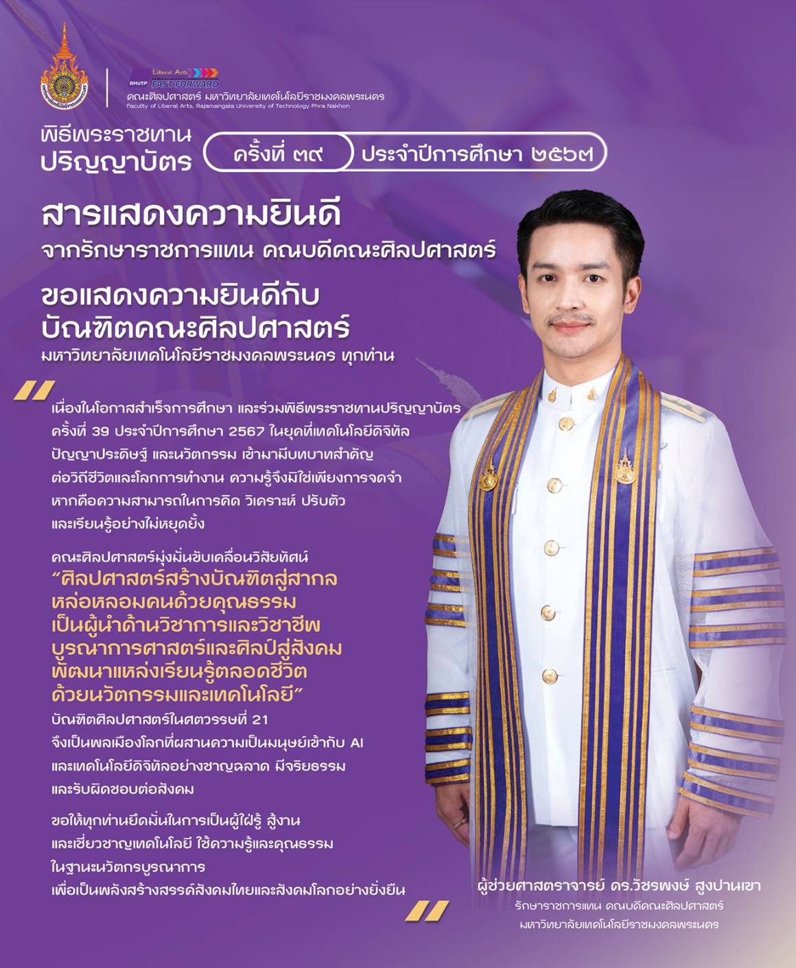งานสื่อสารองค์กรงานเทคโนโลยีดิจิทัลทางการศึกษาทั่วไปนักศึกษาประชาสัมพันธ์ สารจาก ผศ. ดร. วัชรพงษ์ สูงปานเขา รักษาราชการแทน คณบดีคณะศิลปศาสตร์ ราชมงคลพระนคร เนื่องในโอกาสที่บัณฑิตคณะศิลปศาสตร์ เข้ารับพระราชทานปริญญาบัตร ครั้งที่ 39 ประจำปีการศึกษา 2567 Posted Tuesday, 10 March 2026 Web Admin : [PoohAee] https://youtu.be/YJvuloVZefU